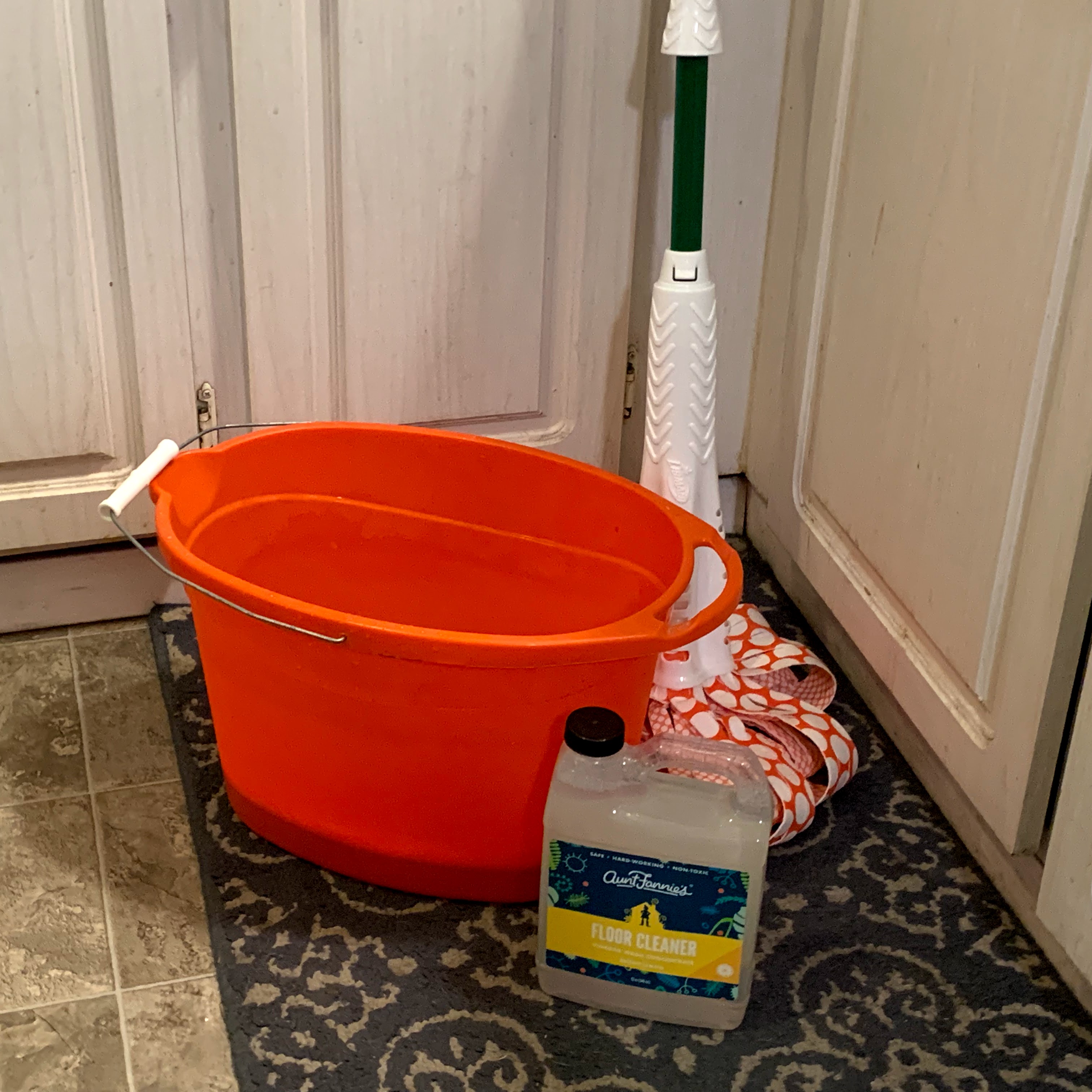 After I swept, I grabbed the bucket and mop, and diluted one-half cup of Aunt Fannie’s Vinegar Floor Cleaner with two gallons of warm water.