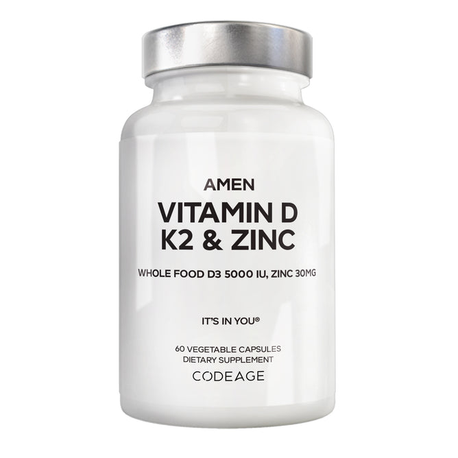 - Amen Vitamin D, K2, and Zinc supplement delivers 5000 IU of vitamin D3 as cholecalciferol, 30mg of zinc as amino acid chelate, and vitamin K2 (MK-4 & MK-7), along with an organic blend of apple, blueberry, cranberry, and elderberry powder.