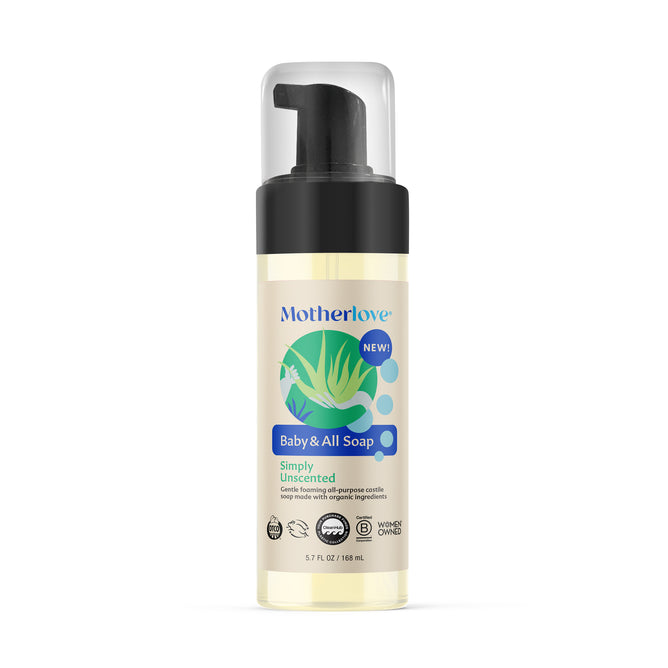 Motherlove's Baby All Soap is an all-purpose unscented foaming castile soap made with organic ingredients. Gentle enough for use on infants, baby, kids of all ages, during pregnancy, and while breastfeeding, yet strong enough to take on dirt and grime around the house. Vegan, Certified Organic by Oregon Tilth, and Certified Cruelty Free by leaping bunny.