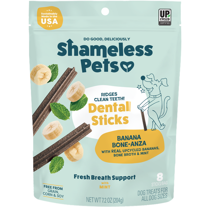That’s a pretty common question when it comes to dog dental sticks. These Shameless Pets Banana Bone-anza Dental Sticks come in a package of eight, but we don’t recommend giving your dog them all in a day. If you want, you can give your dog one dental stick a day, but it’s also okay to spread them out through the month so they last, too.