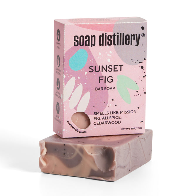 - Sunset Fig: If “late summer” were a scent: freshly plucked juicy mission figs with jet black skin, dipped in lemon sugar and spice. This soap is made with poppy seeds for a light exfoliation.