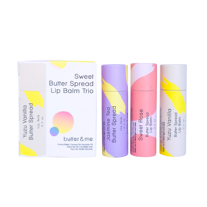 Sweet: Indulge in the luxurious Sweet Butter Spread Lip Balm Trio, your eco-conscious choice for superior lip hydration. Featuring double the usual cocoa butter and coconut oil, this trio delivers deep moisture across three divine scents: exotic Yuzu Vanilla, elegant Jasmine, and classic Sweet Rose. Ideal for those who crave continuous hydration with a touch of sweetness in their daily lip care.