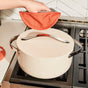 Your new best friend for pastas, roasts, stews, bread baking, and more. This durable non-stick pot makes cooking easier than ever, cleaning (dare we say) enjoyable, and adds a pop of color to any home.