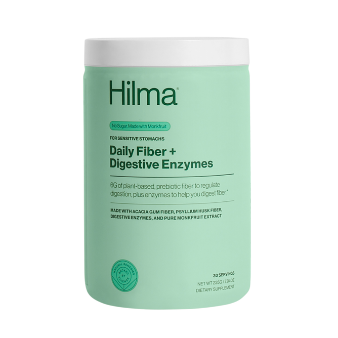 Hilma's Daily Fiber + Digestive Enzymes is a prebiotic fiber for regulating digestion, formulated with fiber-digesting enzymes and made for sensitive stomachs, which can often struggle to digest fiber.