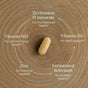 Vitamin C, Vitamin D3, Vitamin E (Acetate), Vitamin K1 & K2, Vitamin B1, Vitamin B2, Vitamin B3, Vitamin B6, Folic Acid, Vitamin B12, Vitamin B7, Pantothenic Acid, Lithothamnion powder, Magnesium, Iodide, Zinc, Selenium, Copper, Manganese, Chromium, Molybdenum, Beta-carotene, Organic Fenugreek Seed, Organic Oregano Leaf, Organic Hawthorn Berry, Organic Hawthorn Leaf and Flower, Grapeseed H2O Extract, Organic Eleuthero Root, Organic Astragalus Root, Elderberry, Organic Schizandra Berry, Organic Maca Root Powder, Organic Chamomile Flower, Organic Turmeric Powder, Ginger AqE, Organic Turmeric SCE, Organic Ginger SCE, Ferment Media [Organic Soy Flour, Organic Gum Acacia, Organic Saccharomyces cerevisiae, Organic Maltodextrin, Organic Orange Peel Powder, Organic Carrot Powder, Organic Alfalfa Powder, Lactic Acid Bacteria (L. acidophilus (DSM 21717), B. bifidum (DSM 19818), L. rhamnosus (DSM 16605)), Papain, Bromelain, Organic Blackstrap Molasses, Organic Safflower Oil], Organic Gum Acacia, Silica, Orange Shellac Lac Resin, Carnauba Wax, Maltodextrin.