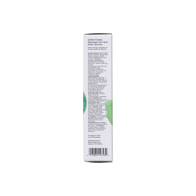 Water, Aloe (Aloe Barbadensis Leaf Juice), Cetearyl Alcohol, Matrixyl Synthe '6 (Peptide: Glycerin - Aqua - Hydroxypropyl Cyclodextrin - Palmitoyl Tripeptide-38), Safflower Seed Oil (Carthamus Tinctorius Seed Oil), Glycerin, Caprylic Capric Triglycerides, Niacinamide, Syntacks (Peptide: Palmitoyl Dipeptide-5 Diaminobutyroyl - Hydroxythreonine - Palmitoyl Dipeptide-6 Diaminohydroxybutyrate), Glyceryl Stearate, Isopropyl Palmitate, Phenethyl Alcohol, Caprylyl Glycol, Ethylhexyl Glycerin, Sodium PCA, Sorbic Acid, C10-18 Triglycerides, Xanthan Gum, Argan Oil (Argania Spinosa Oil), Potassium Sorbate, Resveratrol, Coconut Oil (Cocos Nucifera Oil), Citric acid, Green Tea Extract (Camellia sinensis Leaf Extract), Coenzyme Q10 (Ubiquinone), Acai Extract (Euterpe Oleracea Fruit Extract), Vitamin E (Tocopherol), White Tea Extract (Camellia Sinensis Extract), Pomegranate Seed (Punica Granatum Seed Extract), Vitamin E (Tocotrienol), Steam Distilled Lime Extract (Citrus Aurantifolia Extract)