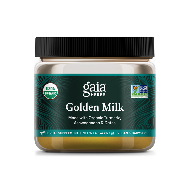 A main ingredient in Gaia Herbs Golden Milk is turmeric, a bright-yellow spice widely enjoyed in Asian cuisines and traditionally used to support a healthy inflammatory response, though it has been regarded as a whole-health tonic for its ability to support the body in a wide variety of ways.* It contains black pepper, which supports the bioavailability of turmeric’s beneficial curcuminoid compounds, as well as ashwagandha, an adaptogen that helps the body handle stress in a healthy way.* Other ingredients include dates, cardamom, and vanilla.