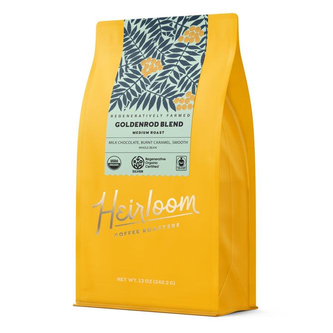 Goldenrod is Heirloom’s crowd-pleasing signature blend, designed to be your daily go-to. With a smooth, chocolatey base and hints of toasted almond and orange zest, it’s versatile enough for any brew method. This blend supports regenerative organic farms and is roasted to balance depth with brightness, making every cup both delicious and dependable. Goldenrod Blend is a Medium Roast Coffee.