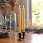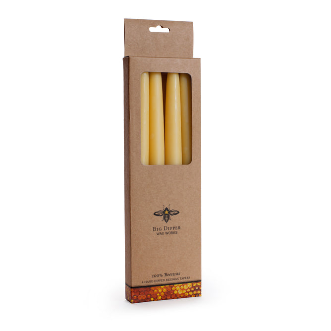 Made from the nectar of flowers by industrious honeybees, beeswax naturally emits a sweet, subtle honey-like fragrance. These tapers are 100% natural, free of paraffin and other toxins. When kept out of major drafts, they burn soot-free and dripless, with a steady, healthy flame that radiates a spectrum of light that matches the sun.
