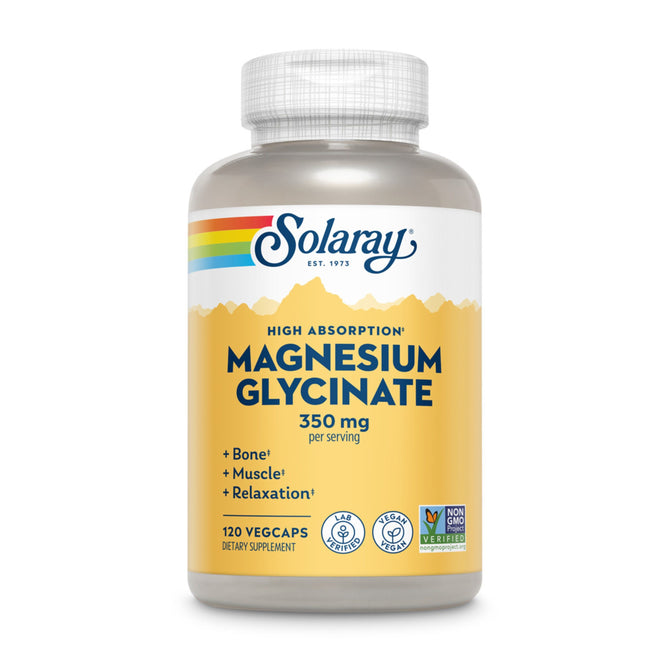 Intended to help with healthy relaxation, our magnesium supplement also helps support strong bones and teeth, muscular and nerve function and a healthy heart. Each serving is conveniently divided into four vegan magnesium glycinate capsules, so you can take it throughout the day for better utilization. Like all Solaray products, Magnesium Glycinate 350mg is lab verified for potency, purity, and identity.Confidence in the Solaray name is just one of the reasons weve been around so long and maintain our place as a leader in the industry. Unlike many other companies, we manufacture almost all our own products, which gives us the ability to thoroughly test and screen raw ingredients for the slightest amount of impurities and manage the production process to provide the best possible quality.