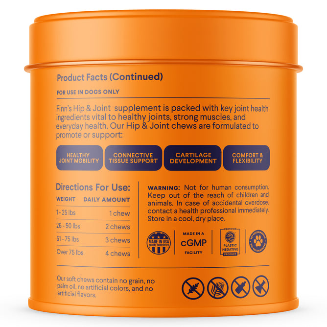 This Finn Hip and Joint Supplement for Dogs is formulated by veterinarians using premium imported and healthy ingredients, including glucosamine, MSM, chondroitin, yucca, vitamins C and E, and organic turmeric. Made in the USA, these cold-pressed chews are manufactured without any added fillers like corn and soy, artificial flavors, or artificial preservatives.