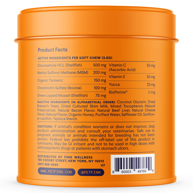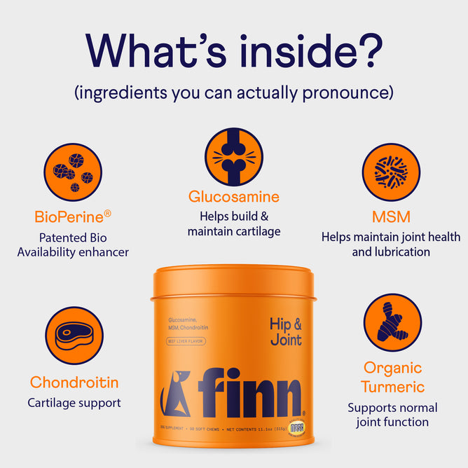 Naturally formulated with organic ingredients vital to healthy joints and strong tissues, this Finn Hip and Joint Supplement for Dogs supports overall mobility and comfort for your canine. Flavored with natural cheese plus real bacon and beef liver, these soft chews are a nutritious as well as delicious treat for your favorite friend.
