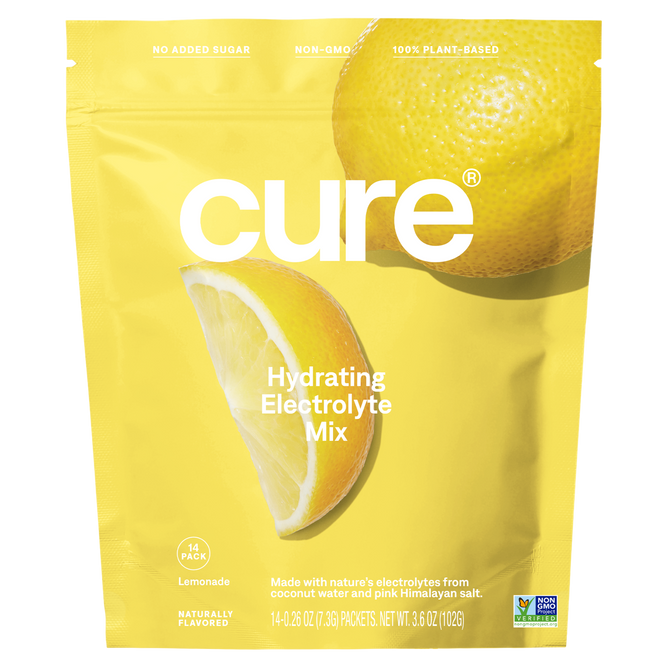 Cure's Hydrating Electrolyte Drink Mix is made with nature’s electrolytes from coconut water and pink Himalayan salt. Without essential electrolytes like sodium and potassium, the body can’t replenish adequately from everyday life: exercise, travel, late nights, or illness.