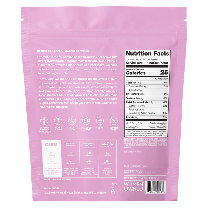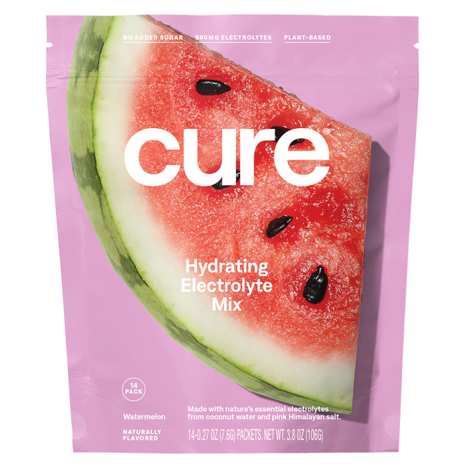 Cure's Hydrating Electrolyte Drink Mix is made with nature’s electrolytes from coconut water and pink Himalayan salt. Without essential electrolytes like sodium and potassium, the body can’t replenish adequately from everyday life: exercise, travel, late nights, or illness.
