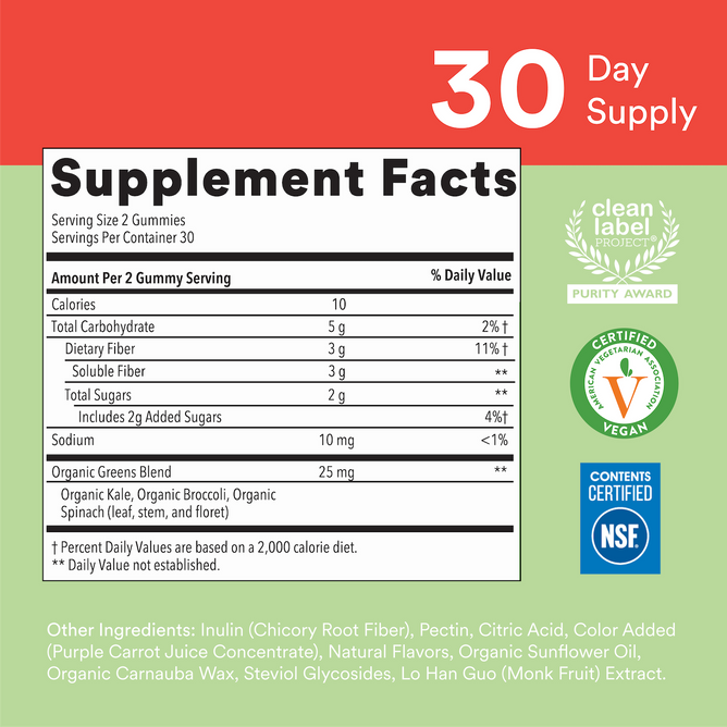 SmartyPants Kids Fiber Veggies is a prebiotic fiber supplement gummy for kids that contains 3 g of prebiotic dietary fiber, inulin, and an organic green veggie blend of organic kale, spinach, and broccoli in every serving. Our science-backed formula supports regular digestion* and uses nutrient forms that your child's body can easily use to help to fill nutritional gaps. SmartyPants supplements are non-GMO, Free From the top 9 major allergens, gluten-free, and made with natural flavors.