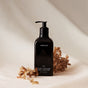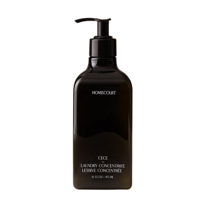 A black Homecourt Laundry Concentrate pump bottle, 16 fl oz (473 mL), with eco-friendly plant-based cleaning agents, shown against a white background. Homecourt Dish Soap elevates your routine with scents of Guatemalan cardamom, dried mate absolute leaves, Sri Lankan cinnamon, carrot seeds and leaves, Indonesian patchouli oil, and vetiver oil. A black pump bottle of Homecourt Laundry Concentrate stands upright on a neutral fabric surface, surrounded by dried beige flowers. The eco-friendly cleaner’s sleek design and soft lighting highlight its elegant appeal. A woman with long dark hair sits barefoot outdoors on a wooden stool. Beside her, a woven basket holds Homecourt Linen Spray and an eco-friendly beige cloth. A white sheet hangs in the background. Three black bottles of Homecourt Linen Spray are arranged with dried hydrangeas and decorative stones on a beige surface. Text above reads: Safe for sensitive skin, made with eco-friendly ingredients, dermatologist tested.