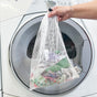 Measures 15"x12". Made from polyester mesh and pull cord designed to be washed and reused indefinitely. Material allows water to flow freely during laundering.