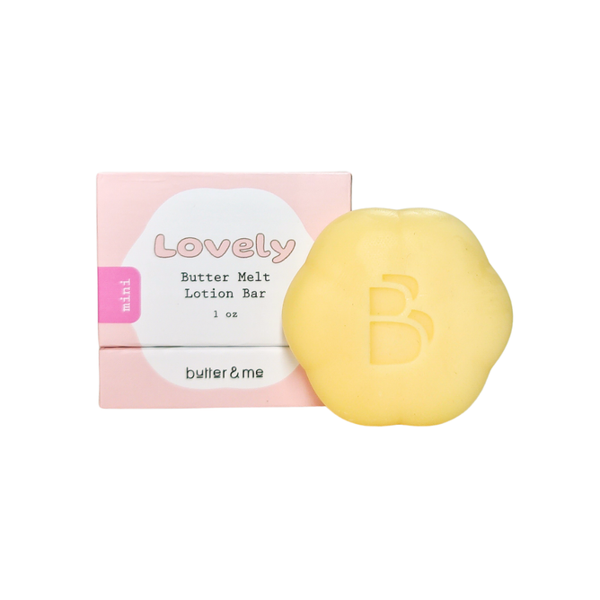 Lovely: Transform everyday skincare into a moment of floral luxury with the Lovely Mini Butter Melt Lotion Bar. This portable moisturizer, scented with Geranium, Sweet Orange, and White Champaca, offers a powdery floral fragrance that promotes wellbeing and leaves skin soft and smooth.
