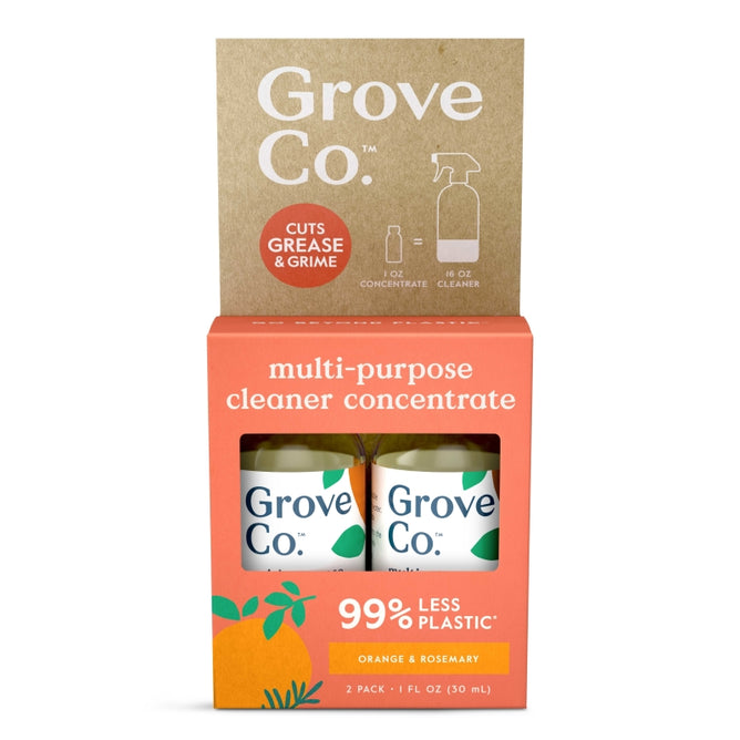 Our Grove Co.™ Multi-Purpose Cleaner Concentrate effortlessly cuts through grease and grime while also helping you clean up your single use plastic habit! Safe on sealed surfaces, such as wood, tile and countertops, our formula is crafted with 92% bio-based ingredients—no triclosan, parabens, phthalates, phosphates, and dyes. Our products are also cruelty-free, meaning no animal testing ever. Each of these two 1oz bottles of Multi-Purpose Cleaner Concentrate mixes with water to create 32oz of cleaning power! Our Multi-Purpose Cleaner Concentrate bottles are made of infinitely recyclable glass, packaged in FSC-certified recyclable cardboard, and designed to pair with the Grove Co.™ Reusable Cleaning Spray Bottle as part of a refillable system to reduce plastic waste.