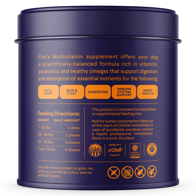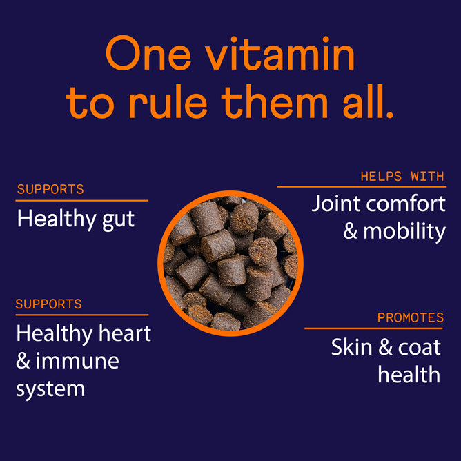 Loved by pets, formulated by vets Formulated with veterinarians to promote everyday wellness and healthy digestion, this Multivitamin contains throughly-researched ingredients that are backed by science. One vitamin to rule them all This multivitamin supplement is formulated with essential vitamins, omegas, and probiotics well-known for supporting hip and joint health, digestion, immune system support, heart health, and skin and coat support.