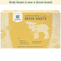 Grab Green Newborn Baby Dryer Sheets feature a calming chamomile scent and highlight natural baby products. With a white lamb on a yellow floral background, these compostable sheets are dye-free and contain no animal-derived ingredients, making them ideal for sensitive skin.