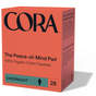 The Cora Peace of Mind Pad, in an orange box labeled OVERNIGHT, contains 28 pads with a 100% organic cotton topsheet. A New Now 2x Drier badge appears on the packaging alongside visible product details.