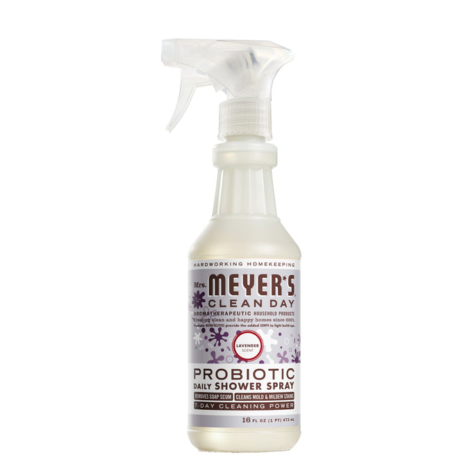 Mrs. Meyers Probiotic Daily Shower Cleaner is a probiotic shower cleaning spray that tackles soap scum and leaves your shower sparkling and smelling like the floral, herbal, garden-inspired scent of Lavender. Your new partners in hardworking home cleaning are probiotic micro-helpers that provide added ‘oomph’ to fight buildups and continue to take action against soap scum.