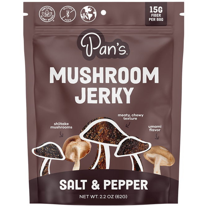 Pan's Mushroom Jerky - Salt & Pepper is a classic flavor with a sharp peppery bite. Made of shiitake mushrooms, Pan's Mushroom Jerky has a delicious umami taste and satisfying texture and is vegan, high in fiber, kosher*, gluten-free, soy-free, and delicious. *Certified.