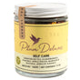 A glass jar of Plum Deluxe Self Care Apricot Elderberry Tea with a yellow label lists ingredients like honeybush blend, elderberry, peaches, apple pieces, and marigold. The jar has a white lid and a beige tag reading Herbal Tea.
