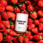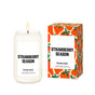 A lit Homesick Strawberry Season candle made of soy wax and natural scents sits in a glass jar next to its strawberry-patterned box. Enjoy this cruelty-free indulgence with matching branding. A Strawberry Season Candle by Homesick, made from cruelty-free soy wax, sits on a pink cube with three fresh strawberries in front, all set against a soft pink background, filling the space with natural scents. A Homesick Strawberry Season soy candle is surrounded by bright strawberries, contrasting the white, cruelty-free candle to create an inviting scene. Rectangular boxes labeled Strawberry Season feature red strawberry patterns in diagonal rows on pink backgrounds, reflecting the natural aroma of Homesicks soy wax candle. Homesicks Strawberry Season Candle boxes, featuring vibrant strawberry illustrations, are diagonally arranged on a red background, creating an appealing repetitive design inspired by the natural scents of soy wax candles.