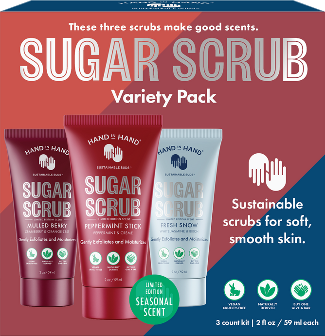 This Mini Sugar Scrub Holiday Kit is perfect for traveling, gifting, and trying out each of the Hand in Hand limited edition scents including Mulled Berry, Peppermint Stick and Fresh Snow.