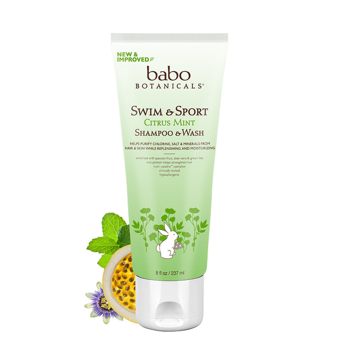 NEW and IMPROVED FORMULA! This purifying shampoo and body wash replenishes, hydrates and purifies the hair, scalp and skin after pool, beach, or outdoor activity that result in sweat or dirt. Perfect for adults, kids and babies, too! A hypoallergenic formula with 22 plant-based ingredients, this 2-in-1 shampoo and body wash is enriched with sustainably sourced Passion Fruit Seed Oil that provides nutritious rich vitamins, Organic Aloe Vera and Green Tea to soothe and condition the skin, and Organic Fruit Peel and Peppermint Oil to add additional vitamin C benefits. Contains Babo Botanicals’ Organic Nutri-Soothe™ Complex rich in vitamins and antioxidants.