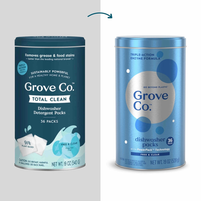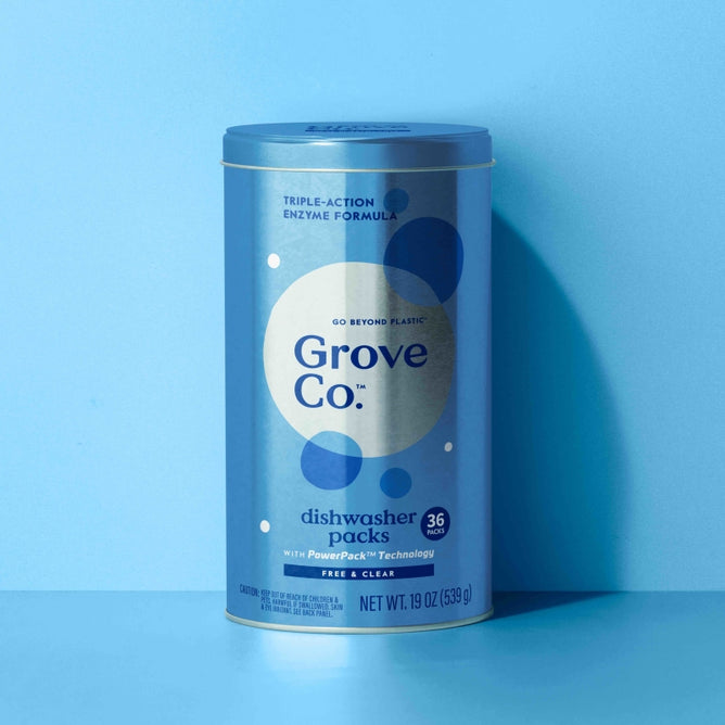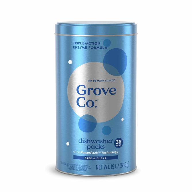 Dirty dishes? Can’t relate. Grove Co.™ Dishwasher Detergent Packs tackle 48-hour stuck-on food effortlessly. The triple-action formula targets grease while preventing water spots. The best part? They're packaged in infinitely recyclable metal** , helping you reduce plastic waste. With PowerPack™ Technology, each pack is pre-measured, making post-meal cleanup a breeze. Plus, this formula is crafted with 86% plant-based ingredients and free from parabens, phthalates, phosphates, chlorine bleach, and dyes.