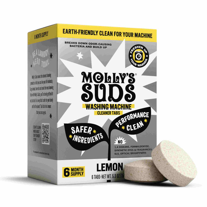 Want cleaner clothes? Start with a cleaner machine! Molly’s Suds Washing Machine Cleaner Tablets safely remove odor causing residues & grimy build-up that accumulates during daily loads, allowing your washing machine to perform its best while looking (and smelling) brand new day after day.