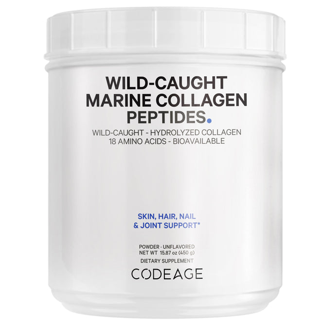 Codeage Wild-Caught Marine Collagen supplement is sustainably sourced from deep-ocean white fish in North American cold waters, providing a high concentration of type 1 & 3 collagen in a convenient powder format.