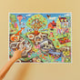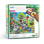 Overhead, trees blossom and birds fly,while underground, animals burrow: the subtleties of farming are revealed alongside inside views of a basement revealing pipes and boiler, even hidden fossils. Everything is carefully labeled on an amply sized poster included with the puzzle. The intelligent and fanciful artist Linda Bleck has created this enormous puzzle. Filled to capacity with detail and delightful moments of discovery, it covers new ground in the floor puzzle category, making this format both a fully educational activity and a rich individual play experience.
