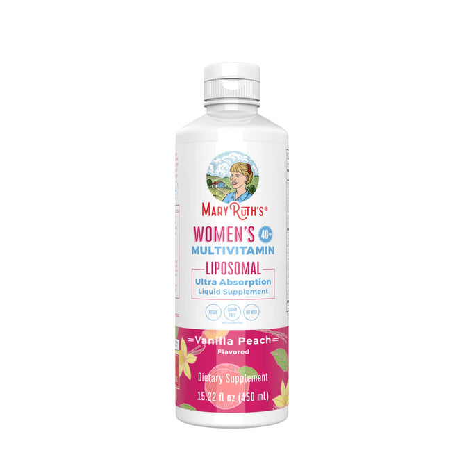 A 15.22 fl oz bottle of MaryRuths Womens 40+ Multivitamin Liposomal dietary supplement in vanilla peach flavor, featuring hormonal support and a multivitamin formula, with a vintage woman’s portrait and colorful label text.