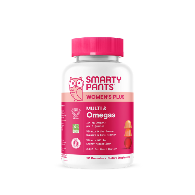 New and improved SmartyPants Women’s Plus Multi Omegas is a premium, multifunctional gummy supplement that contains more of the nutrients you want in a delicious format that is easy to take! Each serving delivers a robust blend of vitamins and nutrients including omega-3 DHA and EHA from algal oil, CoQ10, folate in the premium form, methylfolate, to help form red blood cells*, biotin to help maintain healthy hair, skin, and nails* and iodine for thyroid support* all in one easy and delicious serving.*